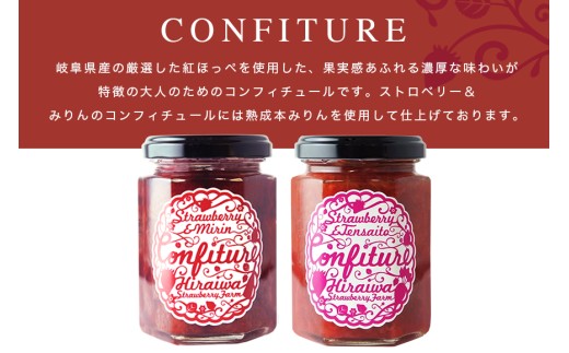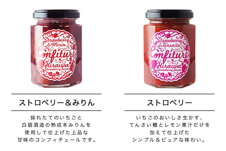 コンフィチュールヒライワでは平岩いちご農園で収穫した甘みと酸味のバランスに優れた「紅ほっぺ」と厳選した天然素材を使用し、手作りでいちごの粒そのままホール仕上げし、コンフィチュールを作っております。