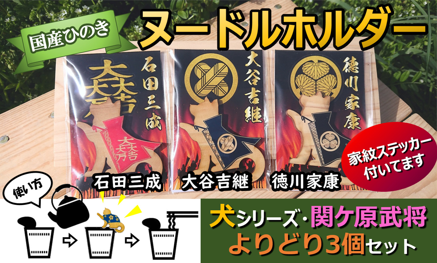 ※国産ひのき「関ケ原武将ヌードルホルダー」よりどり3個セット 犬(石田・大谷・徳川)家紋ステッカー付
