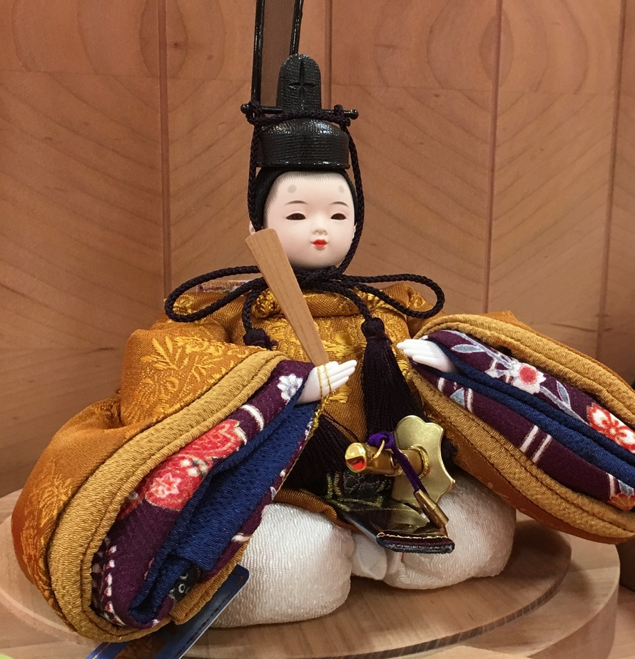 『手まり雛ころろ』の愛らしさはそのままに、ご即位時のご衣裳の「正絹黄櫨染(こうろせん)」を使用し、お姫様には「万葉集 梅花の宴」より梅の花をイメージするお着物を採用。