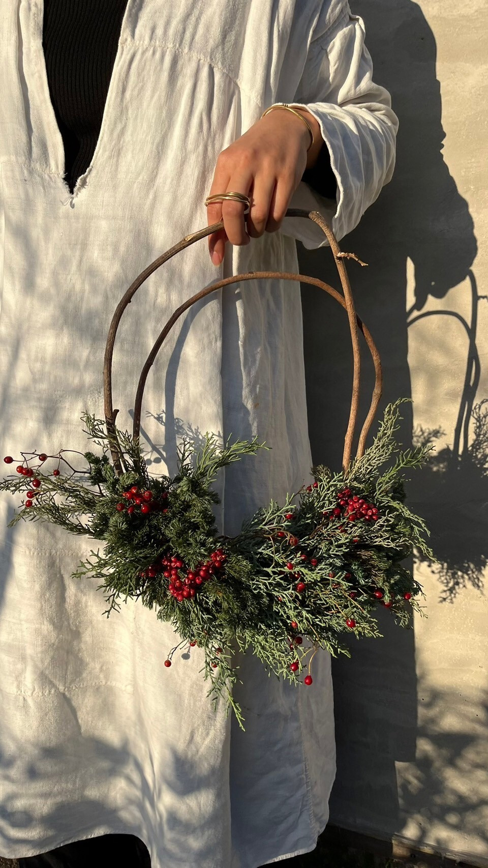 八百津の自然で育った、しなやかな蔦で作ったリースを土台に、アレンジをしていきます。
