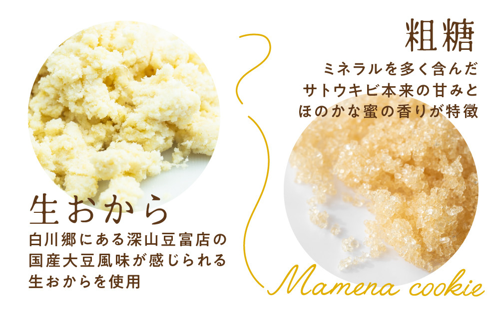 合掌造りで有名な岐阜県白川村のお豆富屋さん「深山豆富店」 その深山豆富の製造工程でできる、国産大豆の生おからを使ったクッキーです。 地元白川村産の米粉と北海道バター、鹿児島県産粗糖で仕上げた程よい甘さとサクッと香ばしい食感が、クセになる美味しさです。