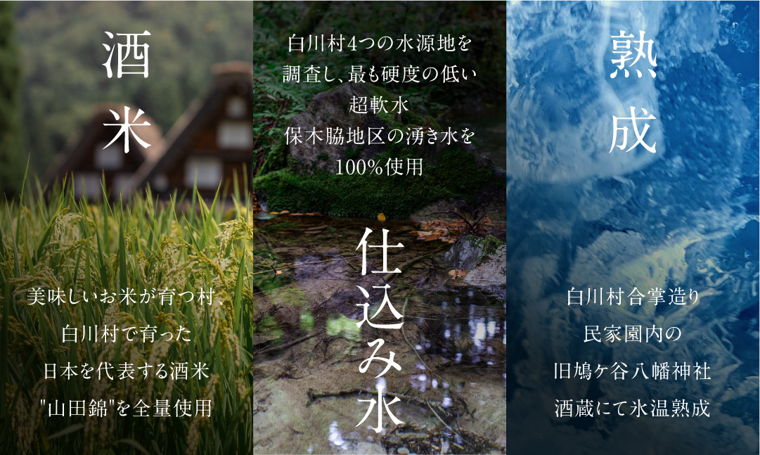 仕込み水には白川村保木脇地区の超軟水の天然水を100%使用しています。