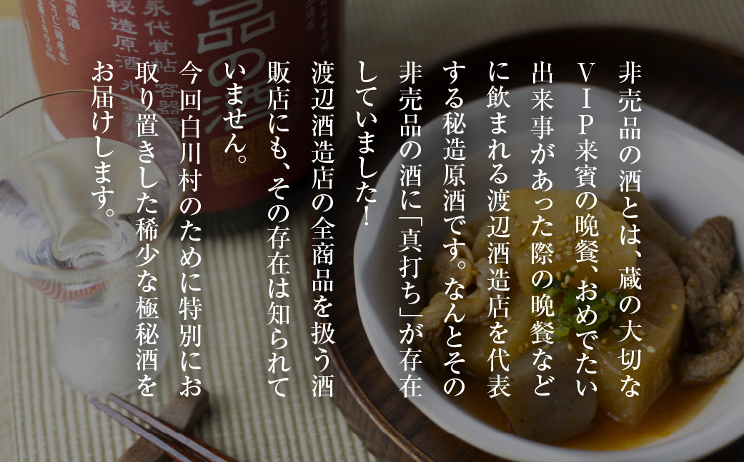 非売品の酒とは、蔵の大切なVIP来賓の晩餐、おめでたい出来事があった際の晩餐などに飲まれる渡辺酒造店を代表する秘造原酒です。なんとその非売品の酒に「真打ち」が存在していました。