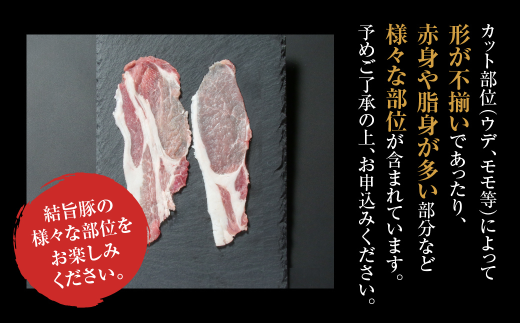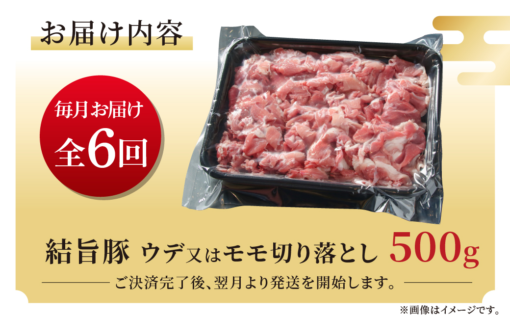 | 容量 | 毎月1回、計6回お届けいたします。 ※1回のお届け内容 結旨豚 ウデ又はモモ 切り落とし 500g |