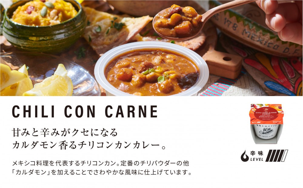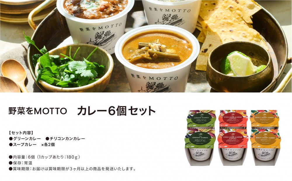 | 容量 | 野菜をMOTTOカレー3種6個セット (180g×6個) グリーンカレー・チリコンカンカレー・野菜スープカレー 各2個 |