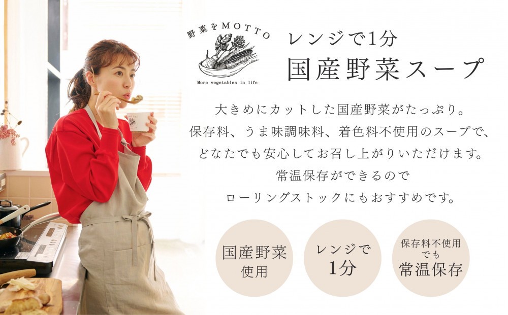 電子レンジで1分、ゴロッと国産野菜を食べられる贅沢スープ。 野菜本来の素材の美味しいを味わって欲しいという想いから、保存料・うま味調味料・着色料不使用。 常温保存なので、いざという時のストックにも。 全商品200kcal以下なので、遅く帰った日の夜食でも罪悪感ほぼ0のヘルシースープです。 ※画像はイメージです。 ※賞味期限3か月以上の商品を配送します。 スープ 惣菜 レトルト インスタント 国産 野菜 加工食品 和風惣菜 雑炊 みそ汁 中華惣菜 点心 セット 詰合せ 食品 おかず 和食 ダイエット 時短 手軽 具だくさん 静岡市 レンジ MOTTO ベジMOTTO