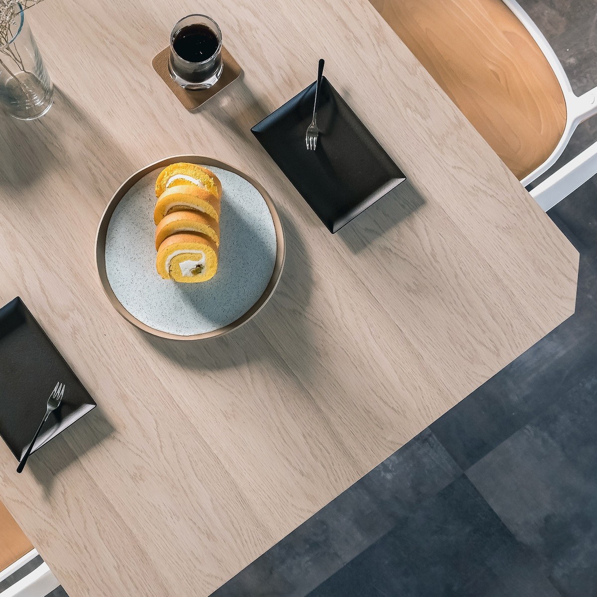 天然オークの板目の天板は、四方を切り落とした変形形状の面を取ることで、シャープさと立体感を醸し出しました。