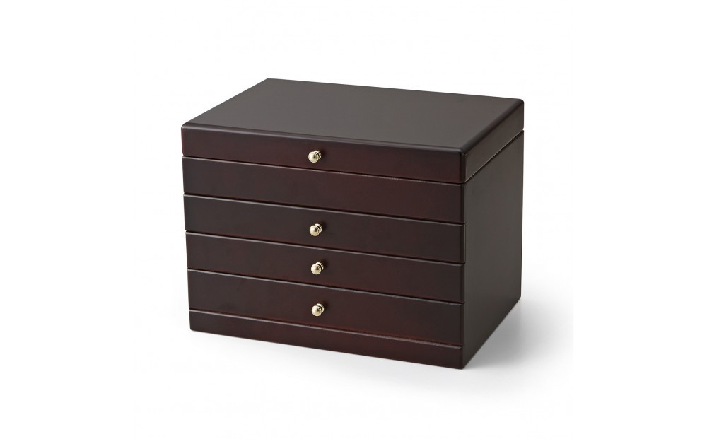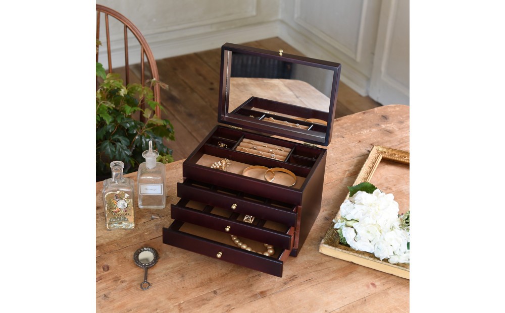 静岡で職人により一つ一つ丁寧につくられた、流行に左右されないシンプルなジュエルケース。艶のあるシックで上品な外観に、ゴールドのつまみ・蝶番が華やかさを添えます。大容量で沢山のアクセサリーを収納することができるのも嬉しいポイントです。