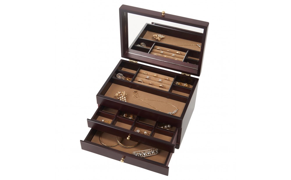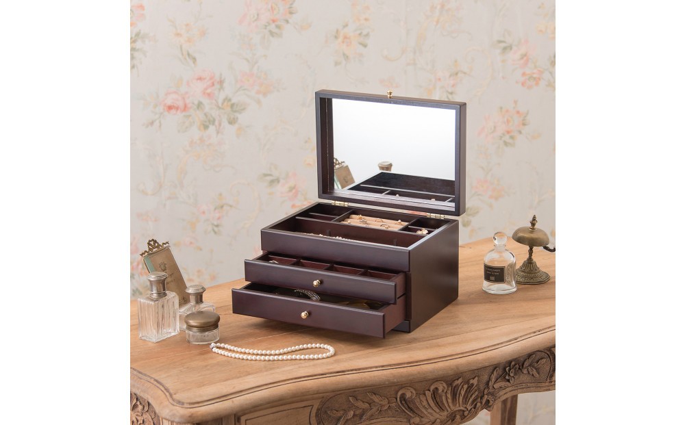 静岡で職人により一つ一つ丁寧につくられた、流行に左右されないシンプルなジュエルケース。艶のあるシックで上品な外観に、ゴールドのつまみ・蝶番が華やかさを添えます。大容量で沢山のアクセサリーを収納することができるのも嬉しいポイントです。