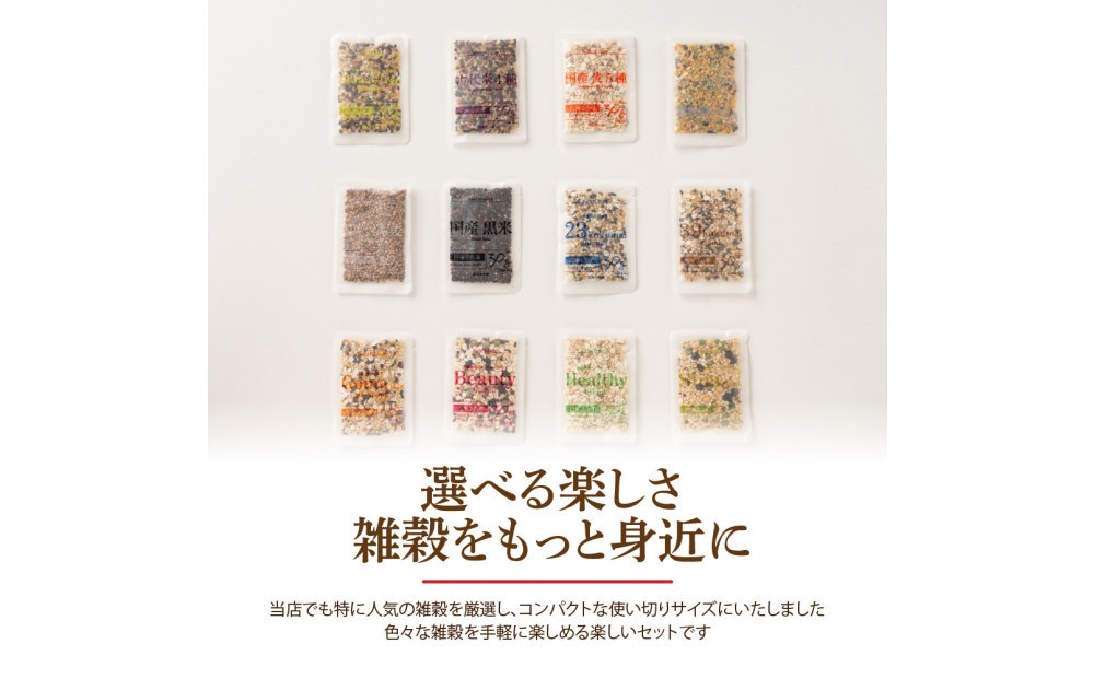 本品は、当店で支持をいただいている雑穀12種類を、使い切りサイズで詰め合わせたお楽しみセットです。