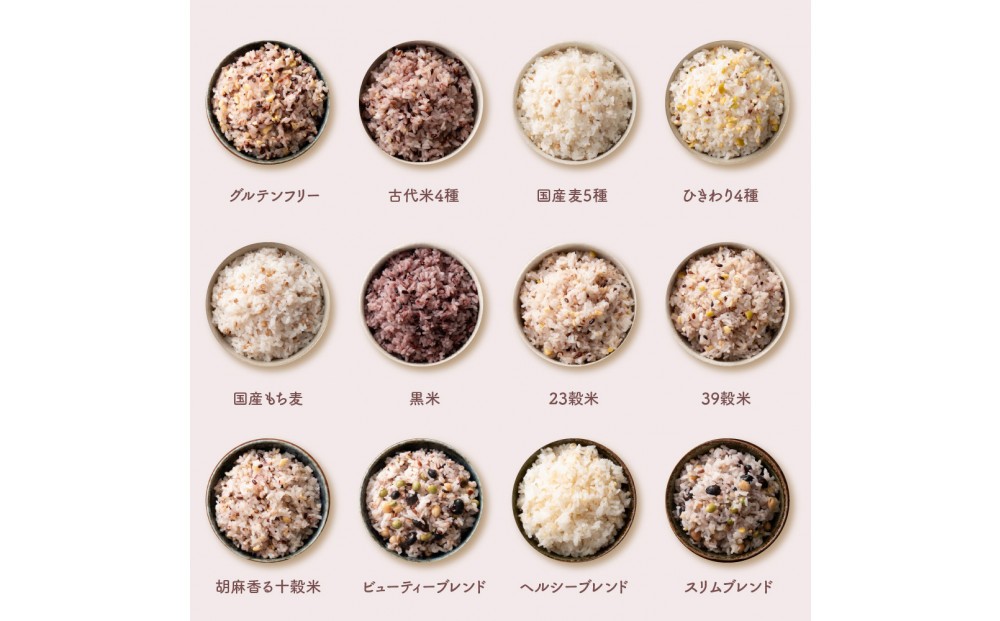 | 容量 | 2合炊飯用30g×48袋 (12種入×4セット) 本品セットに含まれる各雑穀と原材料 【ビューティーブレンド】 胚芽押麦、大豆、黒米、裸麦、黒大豆、小豆、赤米、青大豆、緑米、もちきび、はと麦、アマランサス、白胡麻、黒胡麻、金胡麻、(一部に大豆・ごまを含む) 【ヘルシーブレンド】 丸麦、押麦、はだか麦、発芽玄米、緑米、ひえ、高きび、とうもろこし、もちあわ、アマランサス、白胡麻、黒胡麻、金胡麻、(一部にごまを含む) 【古代米4種ブレンド】 黒米、赤米、緑米、発芽玄米 【ひきわり豆4種ブレンド】 大豆、黒大豆、青大豆、小豆、(一部に大豆を含む) 【グルテンフリーブレンド】 黒米、大豆、もち米、赤米、発芽玄米、青大豆、緑米、小豆、きび、黒大豆、ひえ、高きび、とうもろこし、あわ、アマランサス、白胡麻、黒胡麻、金胡麻、(一部に大豆・ごまを含む) 【スリムブレンド】 丸麦、大豆、黒大豆、緑米、青大豆、こんにゃく米、小豆、もちきび、とうもろこし、ひえ、もちあわ、アマランサス/貝カルシウム、ビタミンC、(一部に大豆を含む) 【23穀米ブレンド】 丸麦、黒米、押麦、大豆、もち麦、もち米、赤米、発芽玄米、青大豆、緑米、小豆、胚芽押麦、もちきび、ひえ、はと麦、とうもろこし、高きび、黒大豆、もちあわ、アマランサス、金胡麻、黒胡麻、白胡麻、(一部に大豆・ごまを含む) 【39穀米】 丸麦、黒米、大豆、押麦、もち麦、もち精白米、はだか麦、胚芽押麦、青大豆、米粒麦、若玄米、巨大胚芽米、もち玄米、発芽玄米、赤米、白もち麦、緑米、きび、小豆、焙煎玄米、胚芽精白米、ひえ、はと麦、高きび、とうもろこし、黒大豆、黒焼き玄米、秘伝豆、発芽赤米、発芽緑米、発芽黒米、大豆胚芽、白えごま、黒えごま、アマランサス、あわ、黒胡麻、白胡麻、金胡麻、(一部に大豆・ごまを含む) 【麦5種ブレンド】 丸麦、胚芽押麦、もち麦、はだか麦、はと麦 【胡麻香る十雑穀】 丸麦、黒米、胚芽押麦、大豆、はだか麦、もち麦、きび、ひえ、はと麦、あわ、白胡麻、黒胡麻、金胡麻、(一部にごまを含む) 【黒米】 黒米(国産) 【もち麦】 もち麦米(国産) |