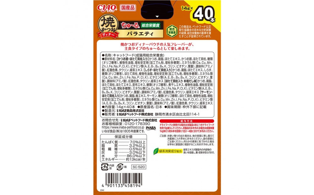 静岡市清水区由比にある『いなば食品静岡工場』で製造している、キャットフードのいなば CIAO猫焼かつおディナー バラエティ 14gx40本入りBOX(ケース:8袋入)です。