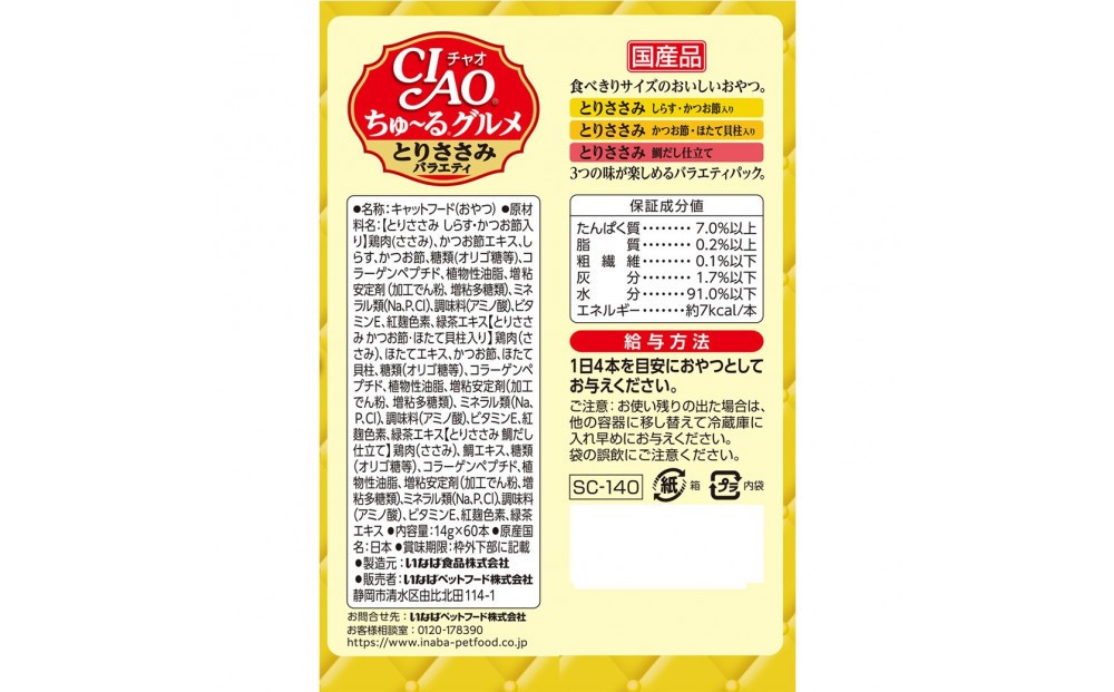 静岡市清水区由比にある『いなば食品静岡工場』で製造している、キャットフードの「 いなば CIAO猫ちゅ~るグルメとりささみバラエティ 14gx60本(ケース:8袋入) 」です。
