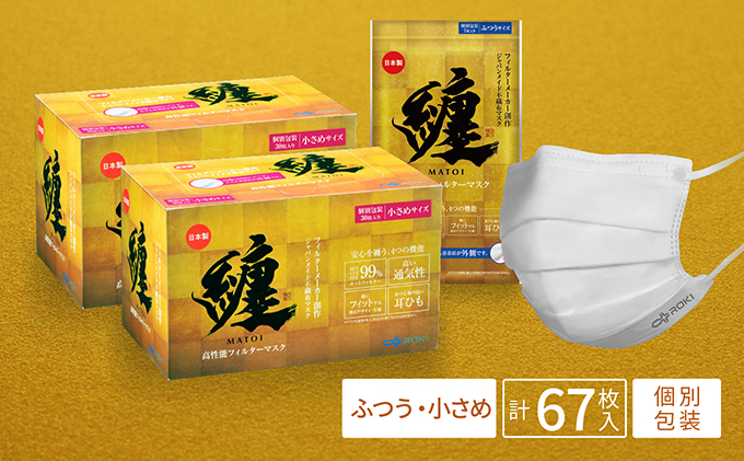 | 容量 | ・セット内容: 纏 (まとい)高性能 不織布マスク 【計67枚】 30枚入 小さめサイズ 2箱、7枚入 ふつうサイズ 1袋 ・本体サイズ: ふつうサイズ 約175mm×95mm 小さめサイズ 約160mm×95mm ・日本製(静岡県浜松市) |