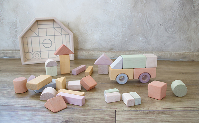 やわらかい色合いのつみきと、ぬくもりを感じる白木のつみきセットです。基尺40mmで32ピース。家の形の木箱が温かみを演出します。木箱の内側にプリントされたガイドラインがあるので、お片付けもパズル感覚で楽しめます。