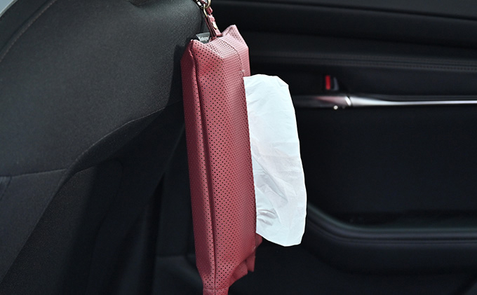 カバーの下部に取り出し口がございますので、ヘッドレストなどに掛けたままティッシュケースの出し入れができます。ループ紐は取り外し可能。リビングやオフィスなどではスマートにお使いいただけます。