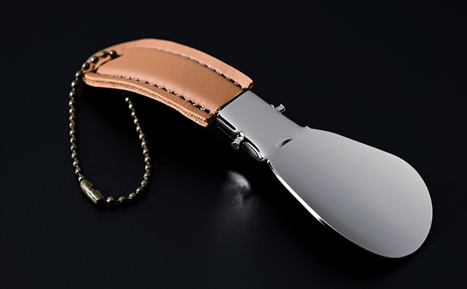 自動車の座席シートにも使われているエシカルレザーで持ち手部分を仕立てた折り畳み靴ベラです。
