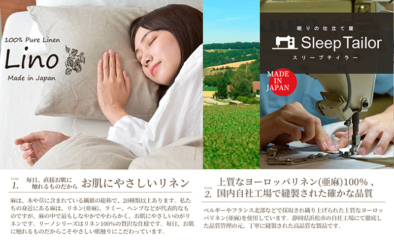 フランス北部やベルギーなどヨーロッパの上質なリネンを使用したカバーリングシリーズ。 国内縫製だから、丈夫で高品質。 「国際規格エコテックス100認証商品」で安心にも配慮しました。ベージュカラーは天然の繊維そのもののカラーで、染色加工などは一切しておりません。そのため、織り糸の産地や入荷時期によりカラーにバラツキがでます。