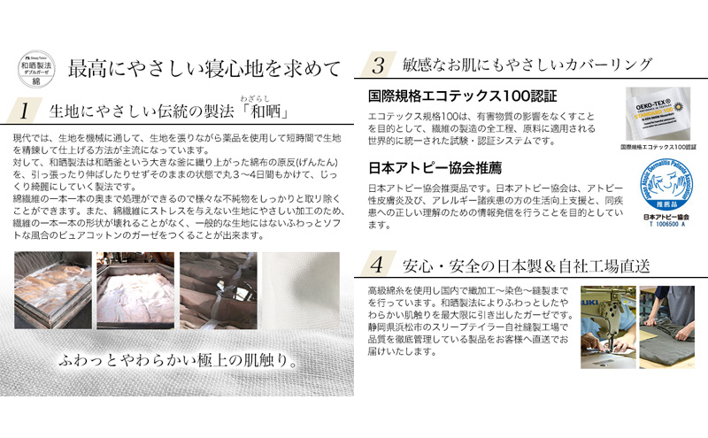 昔ながらの製法で、安心と安全にこだわった和晒ダブルガーゼ。 生地に無理なテンションをかけずに時間と手間ひまをかけてゆっくり加工したガーゼは、繊維がつぶれず、綿本来の持つ品質をそのまま生かしているので、洗うたびふわっとやわらかな風合いに変化します。生地の加工から縫製まですべて国内で加工しています。国際規格エコテックス認証の中でも一番厳しい「クラスI」の認証を得ています。
