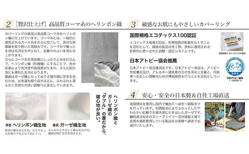昔ながらの製法で、安心と安全にこだわった和晒ダブルガーゼ。 生地に無理なテンションをかけずに時間と手間ひまをかけてゆっくり加工したガーゼは、繊維がつぶれず、綿本来の持つ品質をそのまま生かしているので、洗うたびふわっとやわらかな風合いに変化します。生地の加工から縫製まですべて国内で加工しています。国際規格エコテックス認証の中でも一番厳しい「クラスI」の認証を得ています。