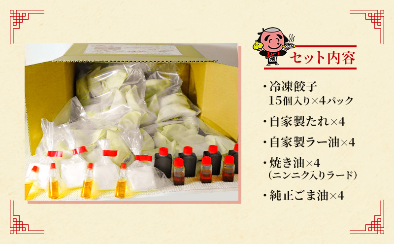 | 容量 | 15個入り×4パック(冷凍餃子)、自家製たれ×4、自家製ラー油×4、焼き油(ニンニク入りラード)×4、純正ごま油×4 |