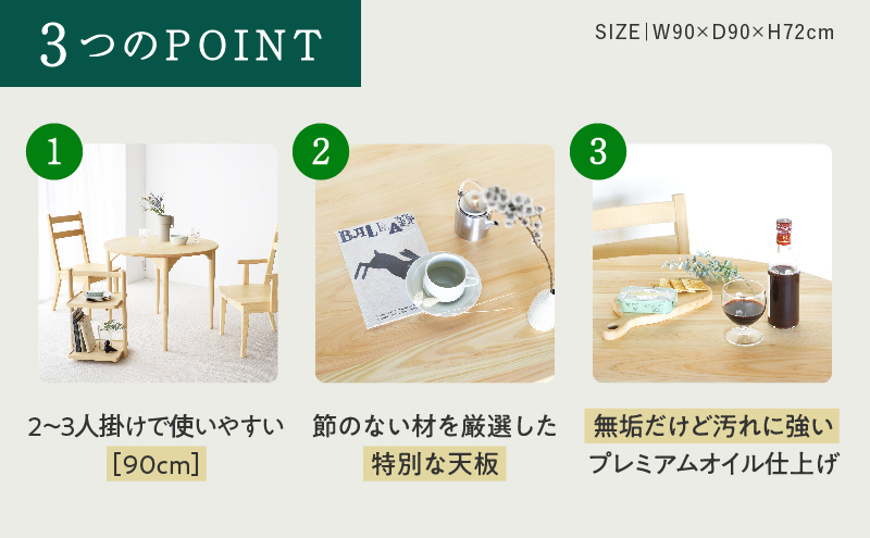 | 容量 | 外寸:W90×D90×H72cm 重量:約12.2kg 素材:国産ひのき無垢材 塗料:天板:植物系プレミアムオイル仕上げ(F☆☆☆☆)、脚部:天然由来の植物系オイル仕上げ(F☆☆☆☆) 製造地:静岡県浜松市 組立仕様:組立式(組立説明書・工具付) |