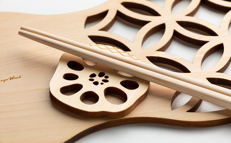 天竜美林と呼ばれる人工林の森林で育った、香りが高く美しい表情の木目を併せ持つ高級木材「浜松天竜ひのき」で作りました。縁起の良い七宝柄のウッドマット、塗装をしていないお箸、見通しが良く縁起ものとされる“れんこん”をモチーフにデザインした箸置きセットです。