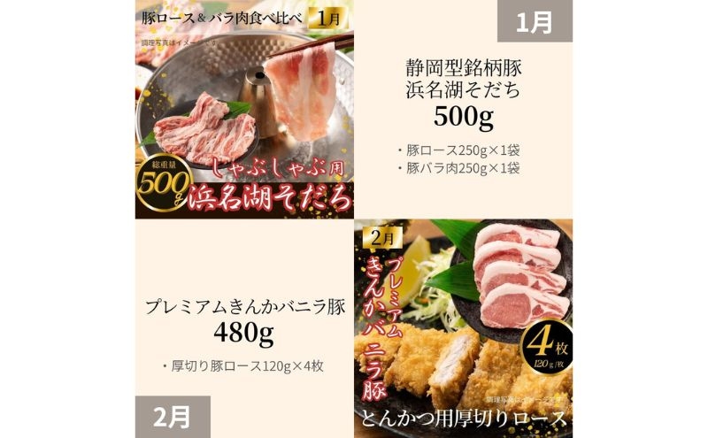 とんきい自慢の豚肉定期便【12か月】毎月お届け!豚肉 浜名湖そだち プレミアムきんかバニラ豚【配送不可:離島】しゃぶしゃぶ すき焼き BBQ 焼き肉 食べ比べ セット 浜松市 [№5360-0723]