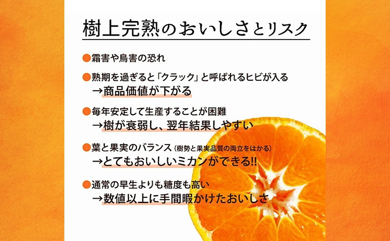 通常より長い期間、樹に成らせることで、糖度を向上させた特別な完熟の早生みかん。