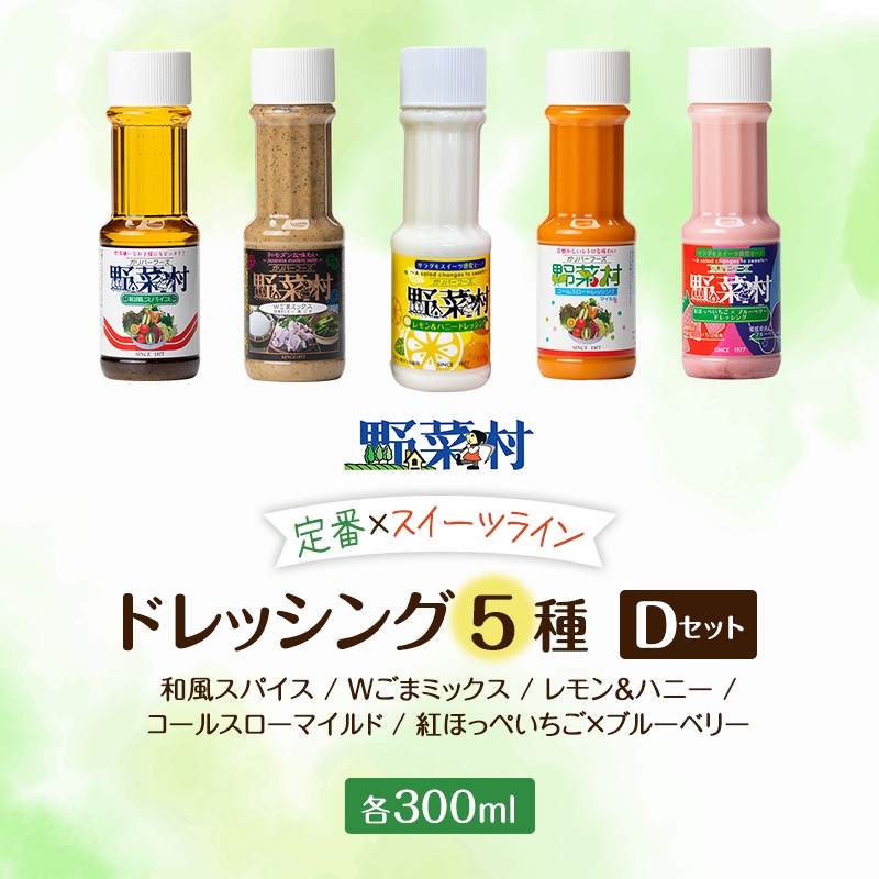 野菜村ドレッシング 5種 Dセット(和風スパイス、Wごまミックス、レモン&ハニー、コールスローマイルド、紅ほっぺいちご×ブルーベリー)各300ml 各1本 計5本 ドレッシング 調味料 静岡 浜松市 [№5360-1591]