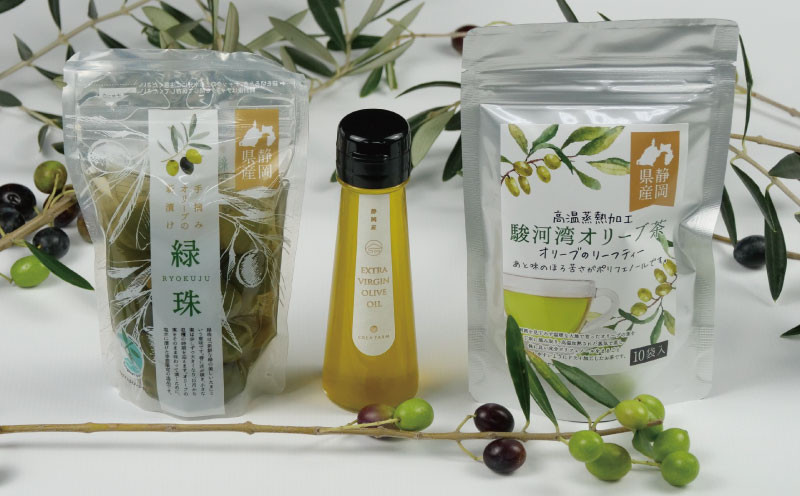 | 容量 | ・エキストラバージンオリーブオイル 50ml 1本 ・オリーブの新漬け 緑珠 果実 80g 1袋 ・駿河湾オリーブ茶 ティーバック 2g×10個入り 1袋 |