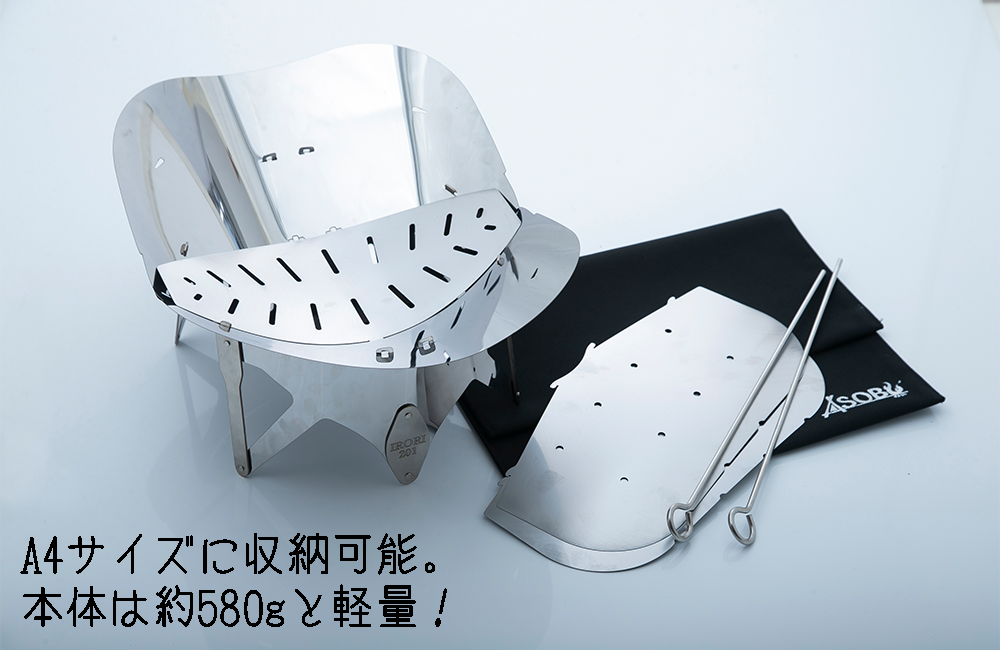 A5サイズに収納できる焚火台で、本体重量は約250gになります。 コンパクトさが最大の特徴では有りますが、 高い燃焼効率を有しているので少し大きめの薪でも燃やすことが可能です。 登山やソロキャンプに携帯し、現地の枯れ木や松ぼっくり等を燃料にすれば、 お湯を沸かしたり缶詰を温めたり簡単な調理を行うことが出来ます。 また、付属の風防を使用すれば保温性が更に高まり、より快適に使用することが可能になります。 そして地面への放熱が少なくなるよう設計されておりますので、机の上などで使用することも可能です。 ☆薪と炭の両方で使用可能です。 セット内容 IRORI101 本体×1台 + GOTOKU01(五徳)×1個 + SHIKIRI01(風 防) + 専用カバー + サービスステッカート(白) ★特許及び意匠権取得商品です★ 提供元:ASOBU株式会社