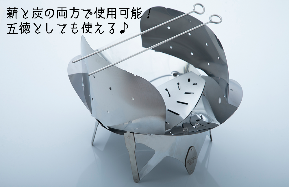付属の風防と火箸を利用すれば五徳にもなり料理など多種多様に使用することが可能です。