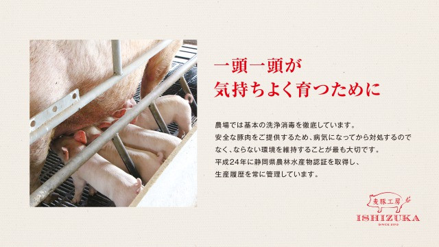 沼津市で唯一、養豚生産から加工製造販売まで一貫してやっています。原料の豚肉は麦を多く与え飼育し、脂の旨みを感じることができます。