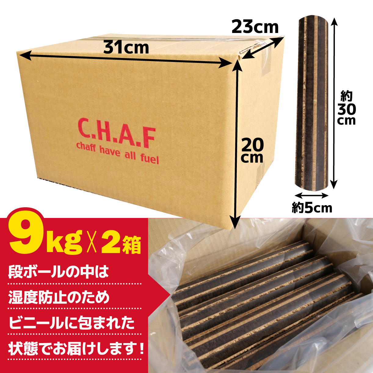 地球にやさしい、新しい循環型資材燃料のカタチ 薪火 延長材 燃料 チャフ C.H.A.F 9kg 2箱 計 18kg エコ お米 もみ殻 暖炉 キャンプ アウトドア 用品 BBQ 薪 ストーブ サウナ 災害用 備蓄 SDGs