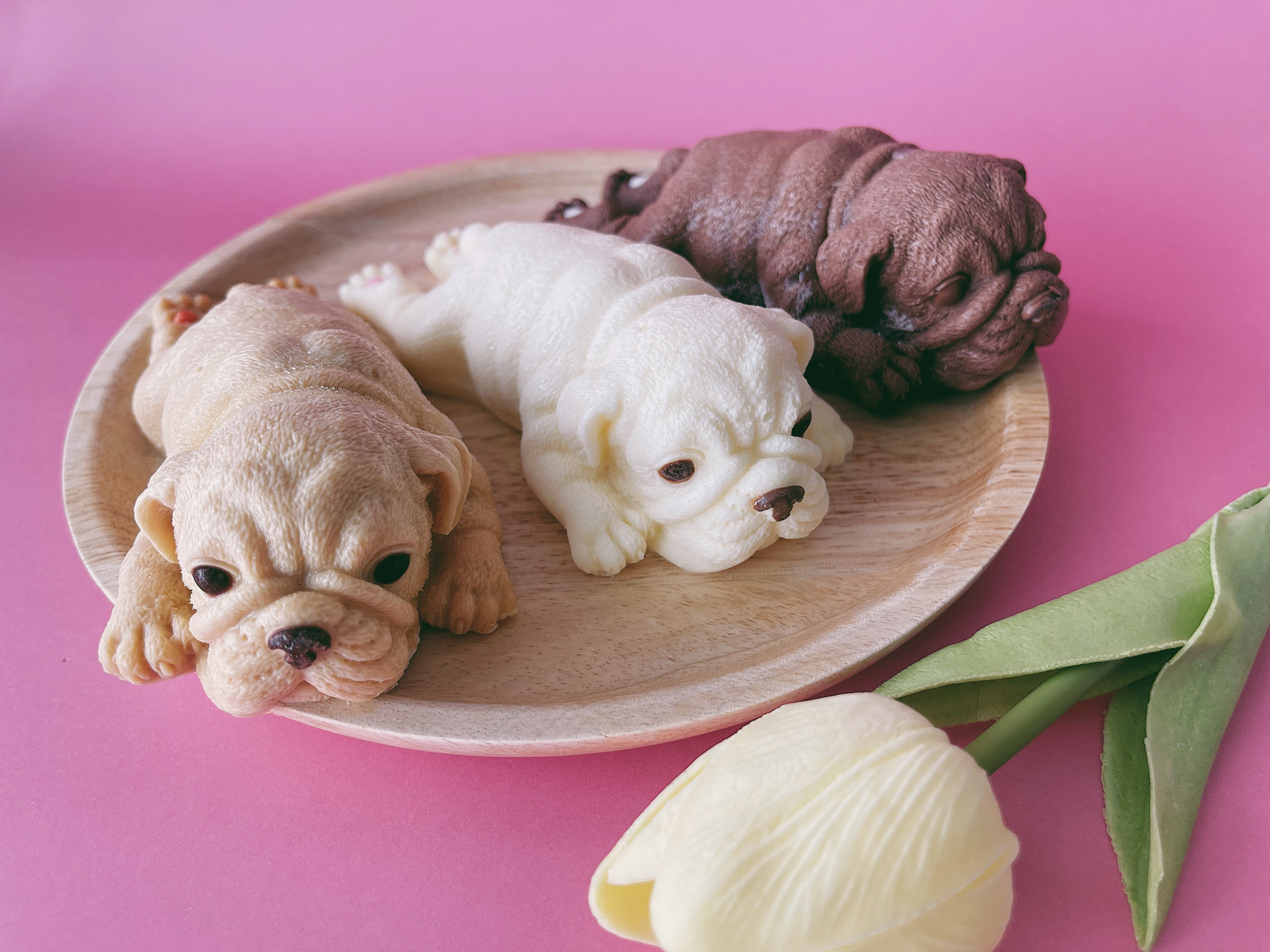 人気のぶさかわ犬3Dケーキ3種(キャラメル1個・チョコ1個・ホワイトチョコ1個)をセットにして、オリジナル化粧箱に入れてお届けいたします。
