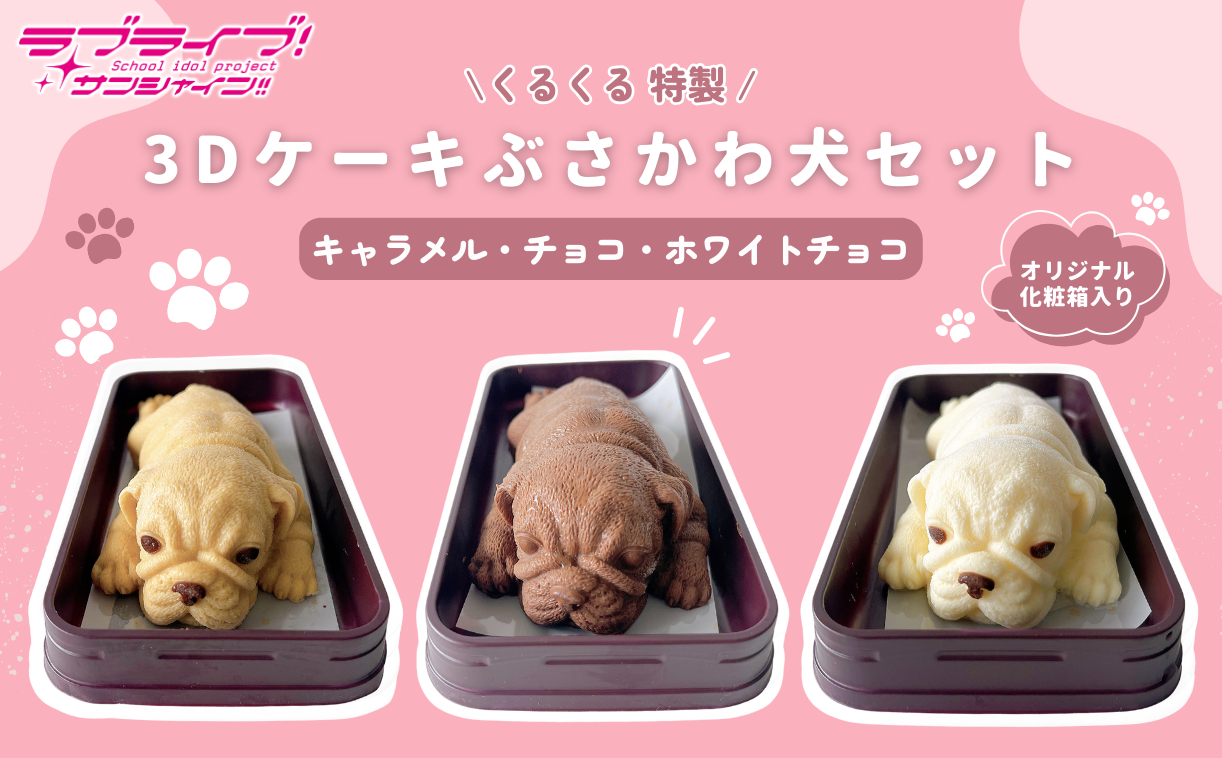 【 ラブライブ!サンシャイン!! × 沼津市市制100周年記念 】 オリジナル化粧箱入り (株)くるくる特製 3D ケーキ ぶさかわ犬セット ( キャラメル ・ チョコ ・ ホワイトチョコ 各1個 ) 母の日 父の日
