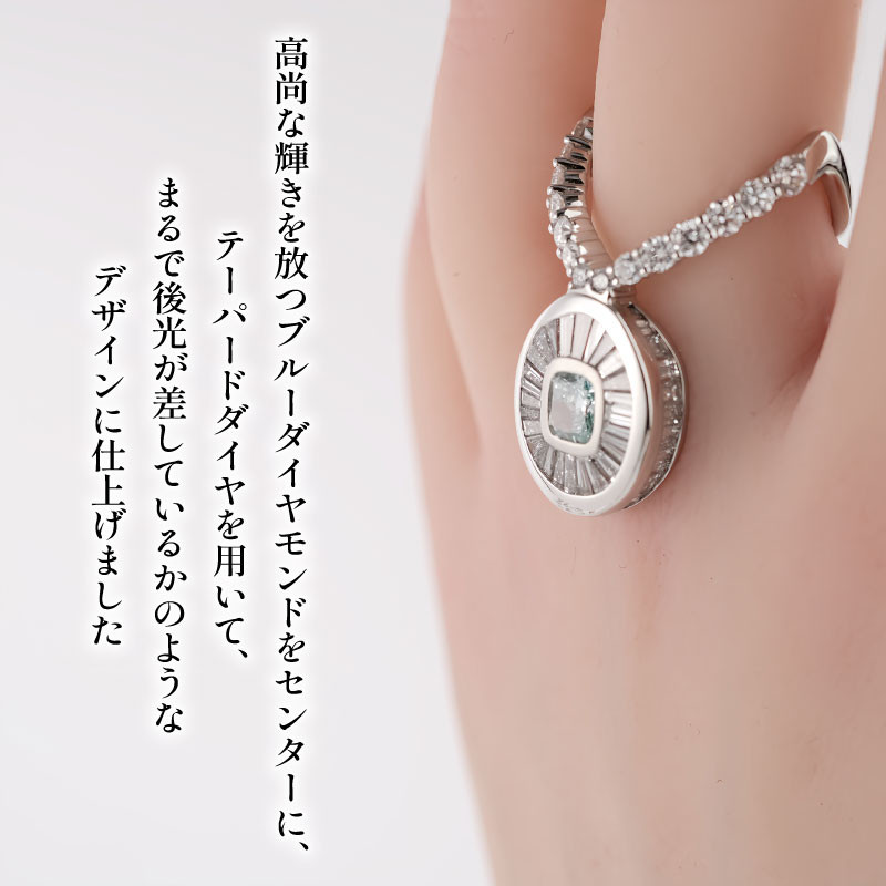 高尚な輝きを放つブルーダイヤをセンターに、テーパードダイヤを用いて、まるで後光が差しているかのようなデザインに仕上げました。