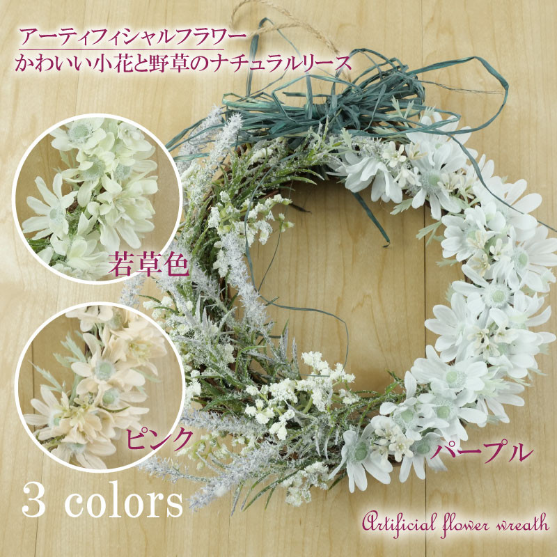 どんな方でも合わせやすい優しいデザインのリース ギフトにも最適 かわいい 小花 と 野草 の ナチュラル リース インテリア フラワー アレンジメント ギフト アーティフィシャル フラワー 造花 記念 お祝い 母の日 父の日 敬老の日 贈答用 プレゼント用