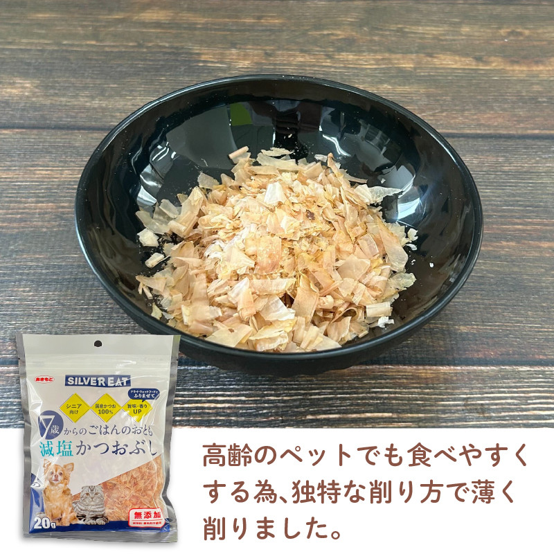 国内製造の厳選した減塩タイプの鰹節を高齢のペットでも食べやすくする為、独特な削り方で薄く削りました。