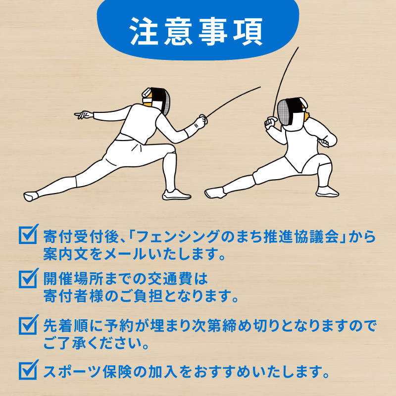 持ち物: フェンシング用具(剣・マスク・ユニフォームなど)・室内履き・タオル・飲み物