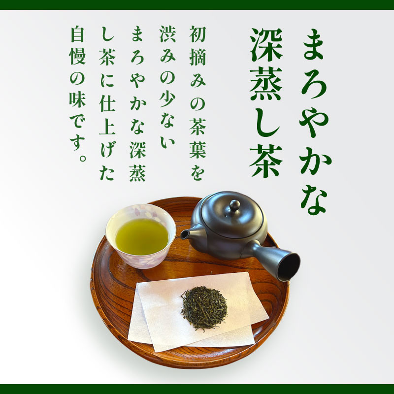 初摘みの茶葉を、渋みの少ないまろやかな深蒸し茶に仕上げた自慢の味です。