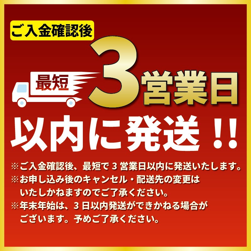 入金確認後3営業日以内に発送いたします。 ※指定日を承ることはできません。予めご了承ください。 ※北海道・沖縄・離島には配送できません。予めご了承ください。 ※年末年始は3日以内発送ができかねる場合がございます。予めご了承ください。 |