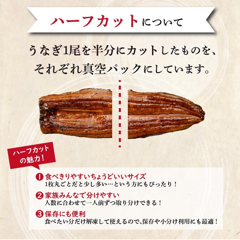| 容量 | 鰻の蒲焼き×ハーフカット16枚 蒲焼きタレ×16個・薬味(山椒)×16袋 ※解凍後の再冷凍はしないでください |
