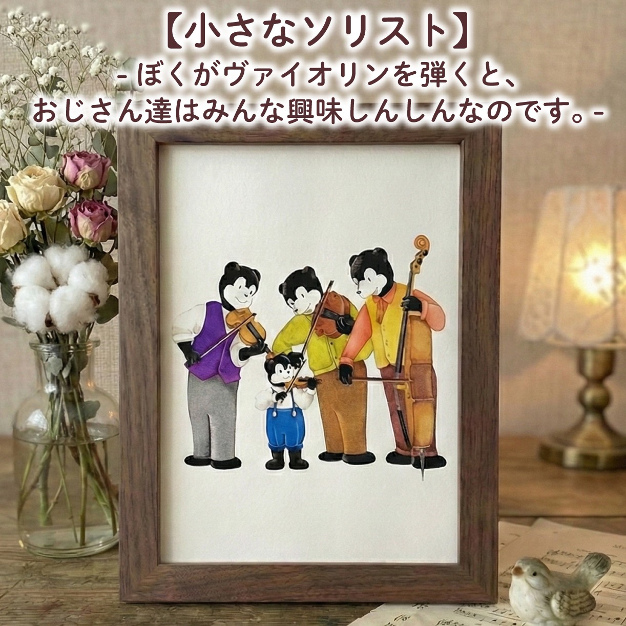 チョイスPayポイントと交換できる品 【小さなソリスト】ぼくがヴァイオリンを弾くとおじさんはみんな興味しんしんなのです 【小さなソリスト】 額縁付き 色鉛筆画 絵 のんちくん 髙尾徳子 美術 アート作品 美術 絵画 インテリア 色鉛筆 プレゼント 音楽 動物 どうぶつ 静岡県 三島市