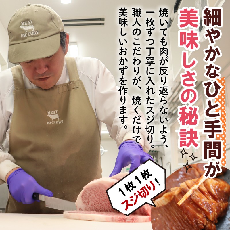 特に味付け肉には、焼いてもお肉が反り返らないよう、一枚一枚丁寧にスジ切りを入れるなど細やかなひと手間が加えられています。