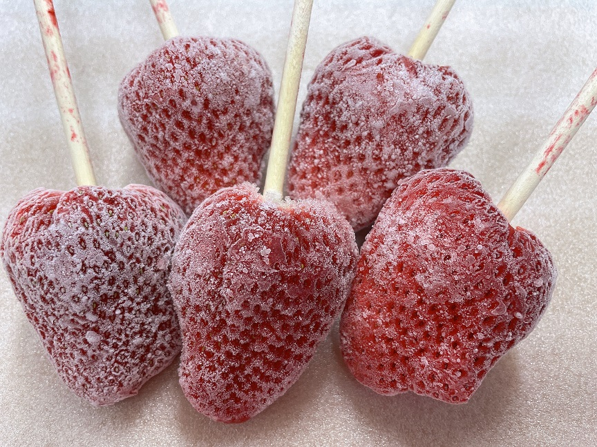 暑いハウスの中で一生懸命に育てた大粒苺「でかほっぺ」をまるごと串にさして凍らせました!