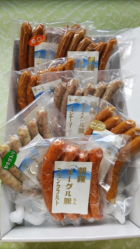 | 容量 | 朝霧ヨーグル豚 ・ウインナーソーセージ (プレーン・辛口・にんにく・チーズ・しそ・わさび):各200g ・フランクフルト:約220g(4本入) |
