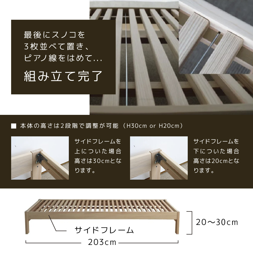 ヘッドフレームの無い無駄を省いたシンプルなデザイン。フレーム本体は桧。体に無害のビーソープという無添加石鹸塗料に蜜蝋を加えた赤ちゃんが舐めても大丈夫な自然塗料で仕上げています。すのこは杉を使用。細かな杉の角材を細かく三分割に分け、取り外してベッドの下のお掃除ができたりと工夫されています。また、非常に通気性の良い構造になっております。組立は非常にシンプルで、女性でも組み立てられるほど簡単です。お布団、マットレスで使用可能です。