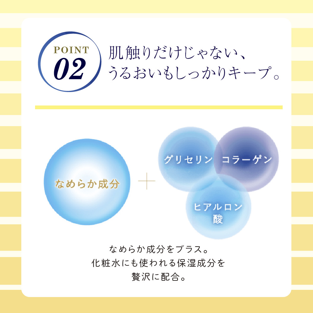 ・化粧水にも使われる保湿成分「グリセリン」「コラーゲン」「ヒアルロン酸」に加え、なめらか成分を新配合。